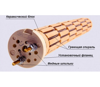Данный тип также известен как секционный "сухой" ТЭН. В его конструкции нагревательный элемент располагается в воздушной среде внутри защитной колбы. В конструкцию входят керамические элементы круглого сечения, соединенные друг с другом по оси и зафиксированные на общем фланце. Количество таких элементов зависит от длины, диаметра и мощности нагревателя.